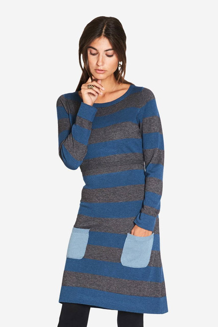 We love this striped knitted nursing dress, and we're told it's one of Milker's best-sellers. The wool/viscouse mix is really warm and isn't itchy. The contrasting coloured pockets are a really unique feature.